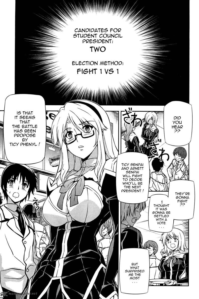 Satellizer and Kazuya return to the plaza, much to Elizabeth's ire since her planned failed. When all try to rationalize the situation, the four Busters burst through a wall, Petty holding a Limiter and the upper half of his Pandora. Elizabeth and Arnett become enraged and Arnett immediately attacks Petty, but Sawatari blocks Arnett's scythe. Petty is amused her the "babies" are willing to fight her when they've killed the more experienced Chevalier members. She introduces her comrades and welcomes the challenge the West Genetics Pandora believe they can offer.