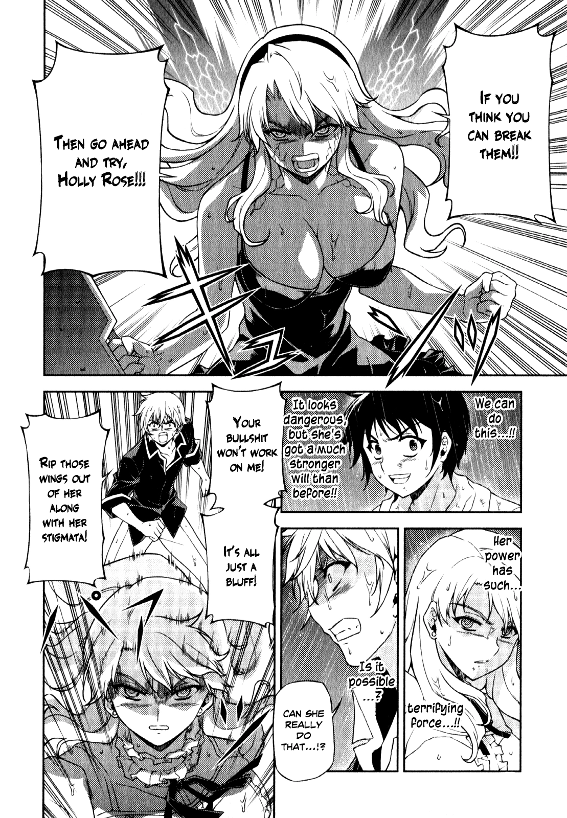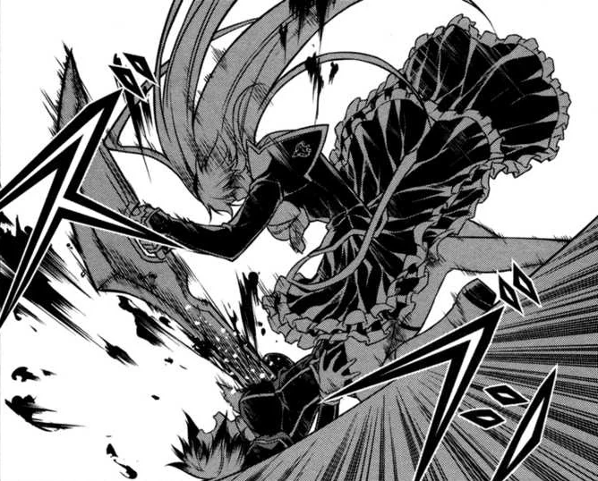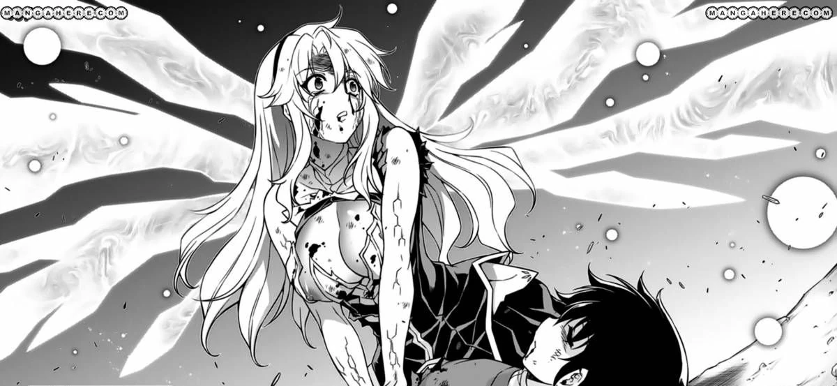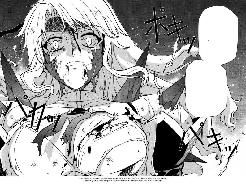 Satellizer is fixated and threatening on the notion that no one shall lay a single finger on her. Her stigmata appear to be beginning to overflow as she looks over her shoulder from the window. Levon has been smashed into the floor, seriously injured, and fellow Pandora Jun collapsed against a wall.