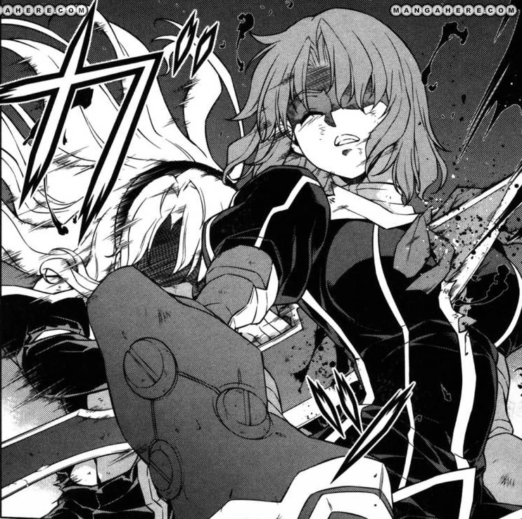 Meanwhile, Ingrid and Attia are battling more Nova Forms above them. Attia is caught off guard, and her Limiter, Mark, takes the hit. Enraged, Attia enters Pandora Mode. However, she still cannot win and is almost killed when Elizabeth shows up. Elizabeth quickly finds the weak points of the enemy Pandora, the Stigmata on their chests, and eliminates them without killing the Pandora themselves.