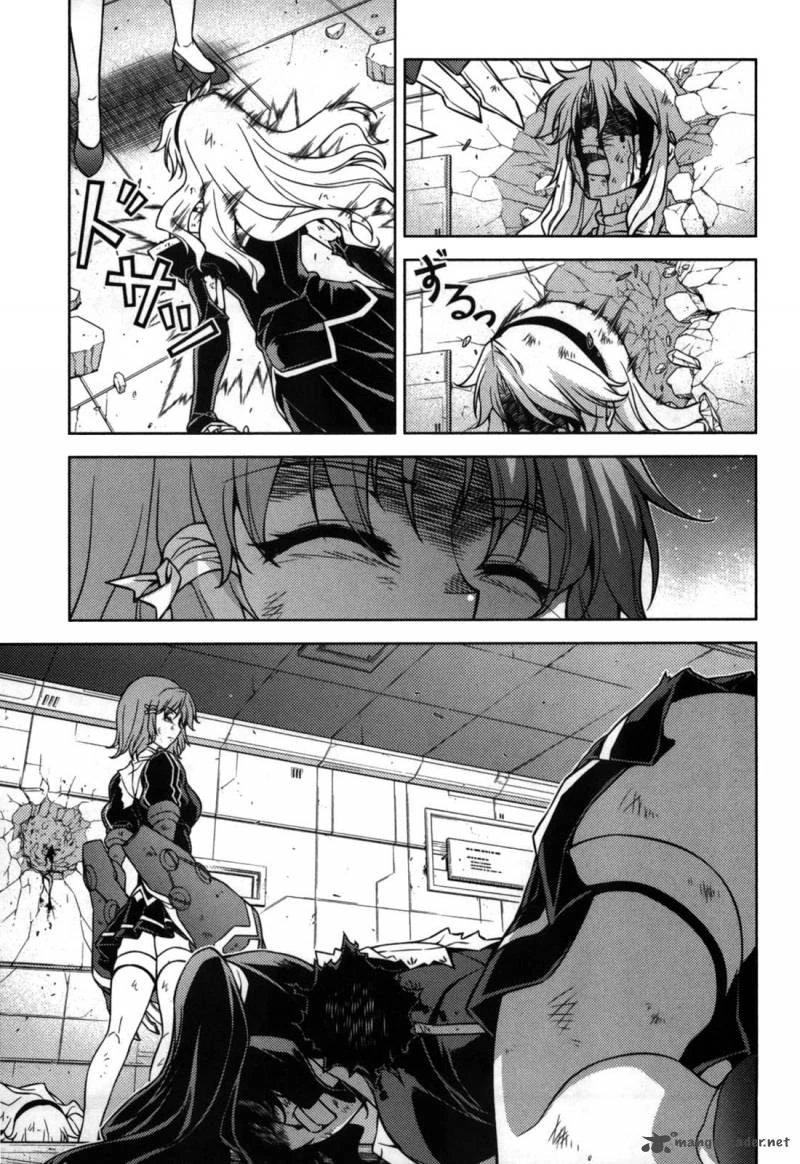 Petty and Sawatari continue with their mission and Isabella covers them with wild cannon-whip attacks, hoping to sever everyone's limbs while The Pandora must defend their Limiters. Ticy performs the Illusion Turn and begins to battle Isabella, and the Buster is pushed to defense However, the slender Jessica Edwin intervenes and everyone watches in shock as their strongest ally is defeated without landing a single attack. When Ticy refuses to give up, she activates her Transcendent abilities, surprising Satellizer. Even then, Ticy is defeated and her arms are severed. Abel wants to save his Pandora, but Isabella happily cuts off his leg and holds him hostage. Isabella begins to molest Abel, and Satellizer refuses to watch. Kazuya then decides to cover Satella who crouches charging energy to release her own transcendent abilities. Elizabeth looks on shocked. Isabella takes full delight of her enemies gruesome situation and presents Abel with a demand he refuses to follow. Jessica responds by smashing Ticy's head with her feet, causing Abel to cry and obey his twisted captor. At that moment Satellizer accelerates at a blinding speed, the same Accel she performed to decapitate the Type-Pandora Nova. However, Isabella dodges her attack. Satella still collapses from the weight of her own attack, but recovers much more quickly. However, the Mexican Buster is much quicker on the draw of her weapon and severs Satella's hands. Isabella then turns her attention to Kazuya and she prepares to blast him out of existence, but her attack is blocked by Cassandra, who stares fiercely at her nephew's attacker.
