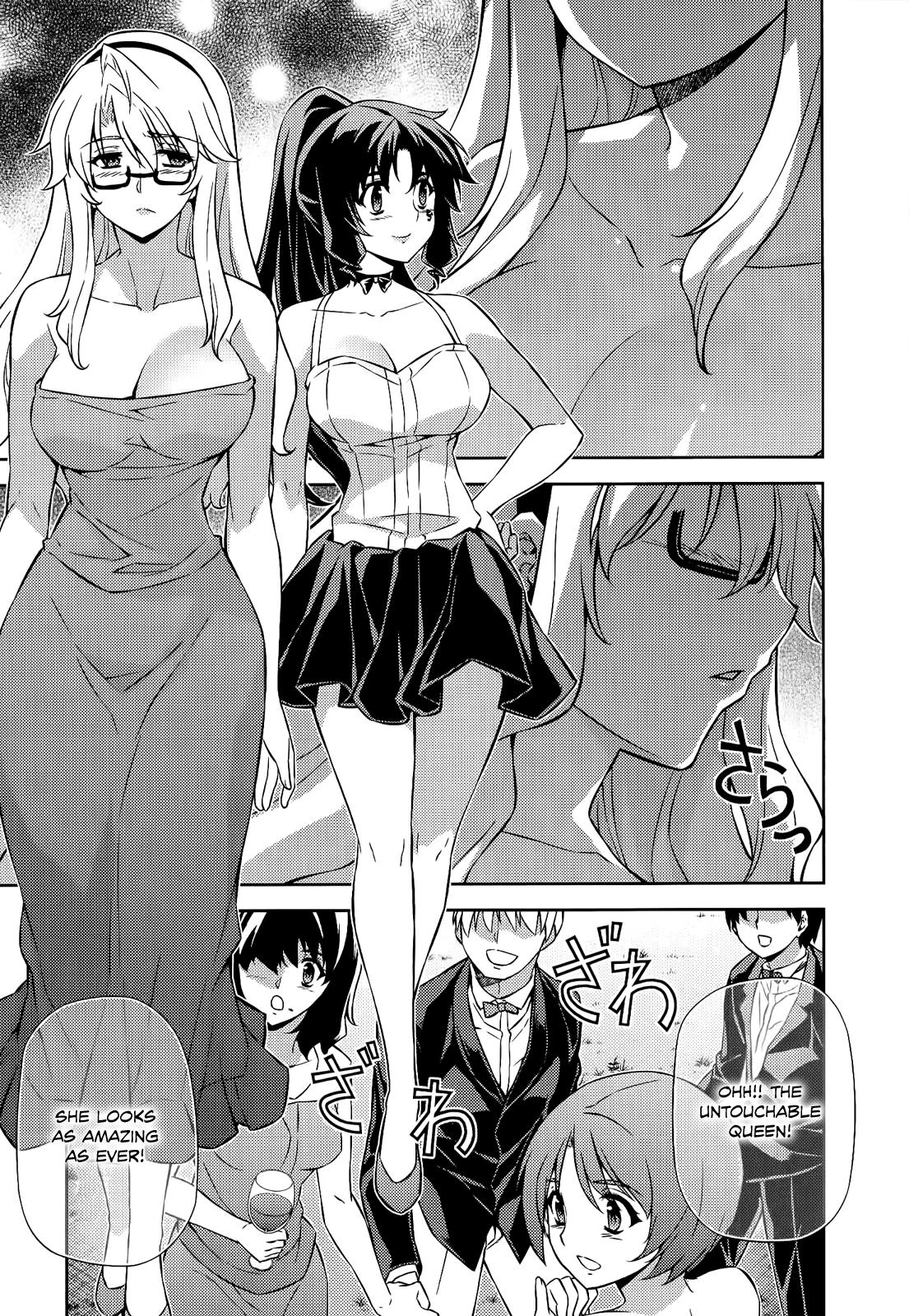 Meanwhile, Satellizer and Kazuya attend the dinner party that was set up by the Student Council to lighten the mood after the 10th Nova Crash. There, Kazuya meets up with Satellizer, but is soon pulled aside by Rana. Satellizer then joins Arnett, Elizabeth, and Attia at their table, after their invitation. There, Satellizer challenges Elizabeth to a drinking competition. Neither of them are willing to give up, so Attia pulls out her "Original Over 90 Percent Cocktail" so she can make Elizabeth win. However, Rana steals the glass from Satellizer, downing the drink and throwing up afterwards.