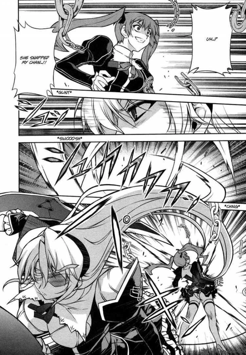 When Satellizer and Ouka see Cassandra strangling a civilian woman, the girls immediately jump to intervene. They are repelled by a swing of Windy May's war-hammer. They watch as the third Legendary Pandora calms her sister.