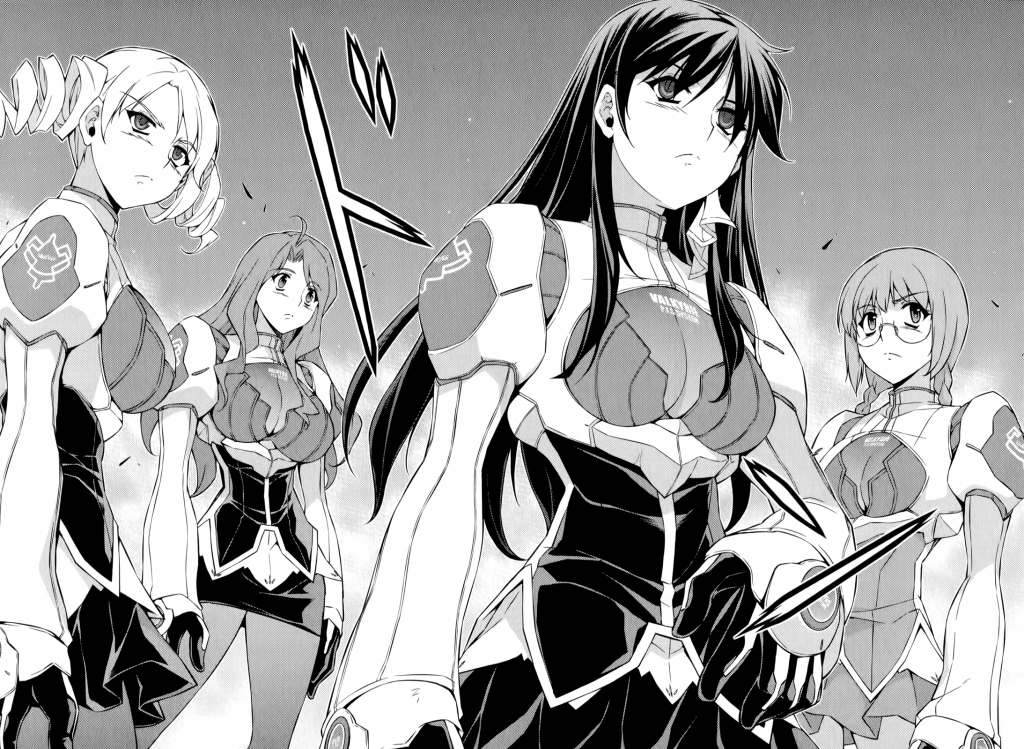 The Valkyries participate in the joint training exercise with their Platoon 13 comrades and the seniors of West Genetics. The platoon combats a dummy Nova, Tiziana acting as a decoy with the Pandora and Franka blocking a Nova Particle Beam. When Cassie moves to finish the target, Christine smugly stops her and leaves Ouka to defeat the Nova, who fails to shut down. All of them are puzzled as the dummies begin to emit a strange phenomenon that resonated with the Pandora. A black smoke envelops the training ground, and the Pandora are all sent into a frenzy while the Valkyries are unaffected, no t bearing actual Stigmata.
